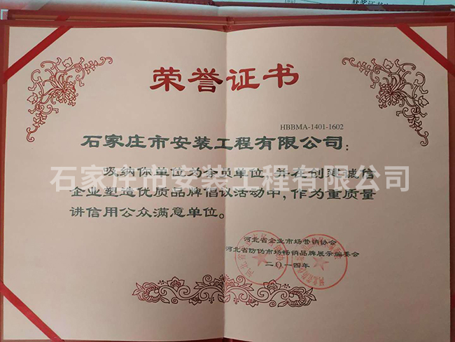 重質(zhì)量講信用公眾滿(mǎn)意單位榮譽(yù)證書(shū)